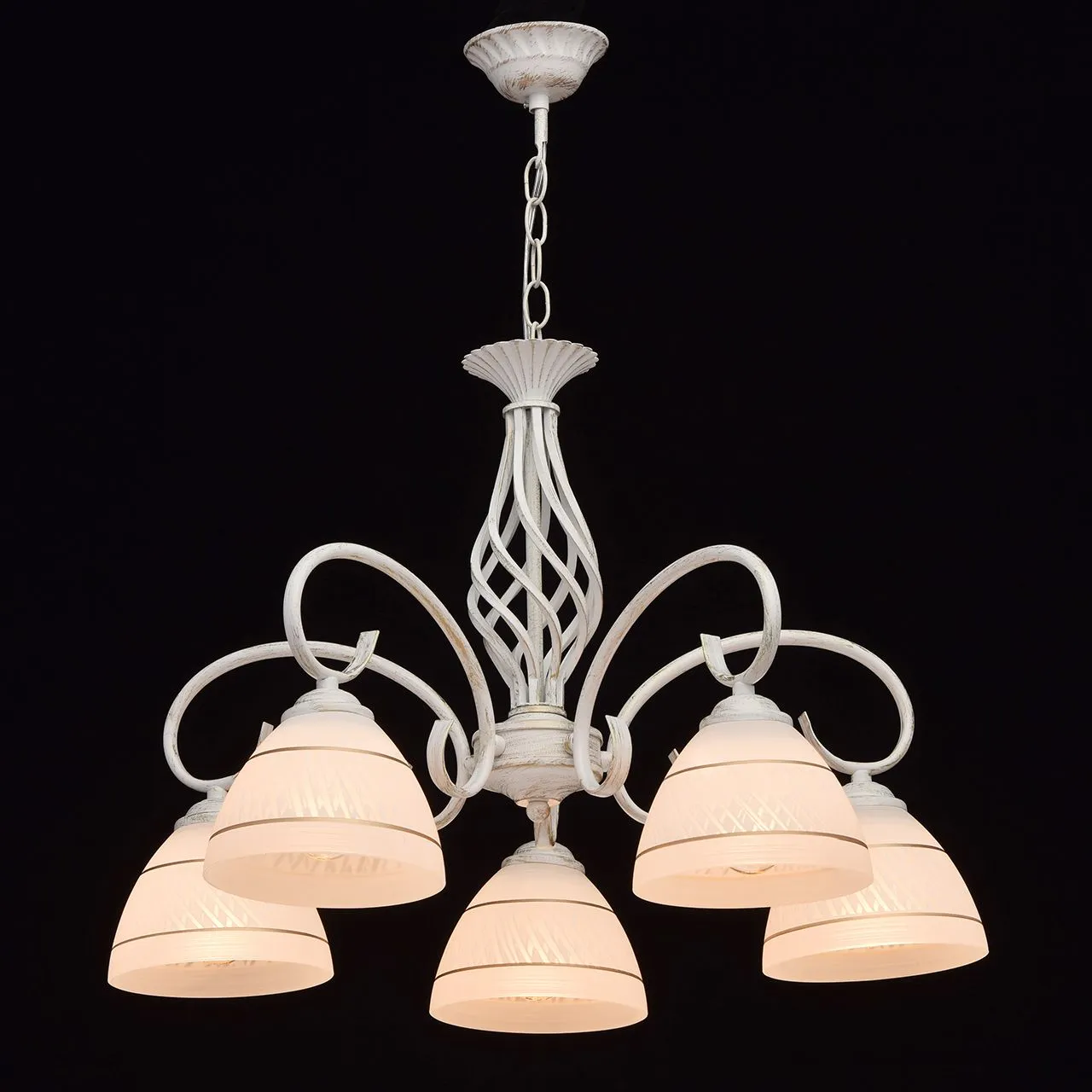 Металлическое основание, окрашенное в белый цвет с золотистой патиной . Плафоны из стекла, отлитого
